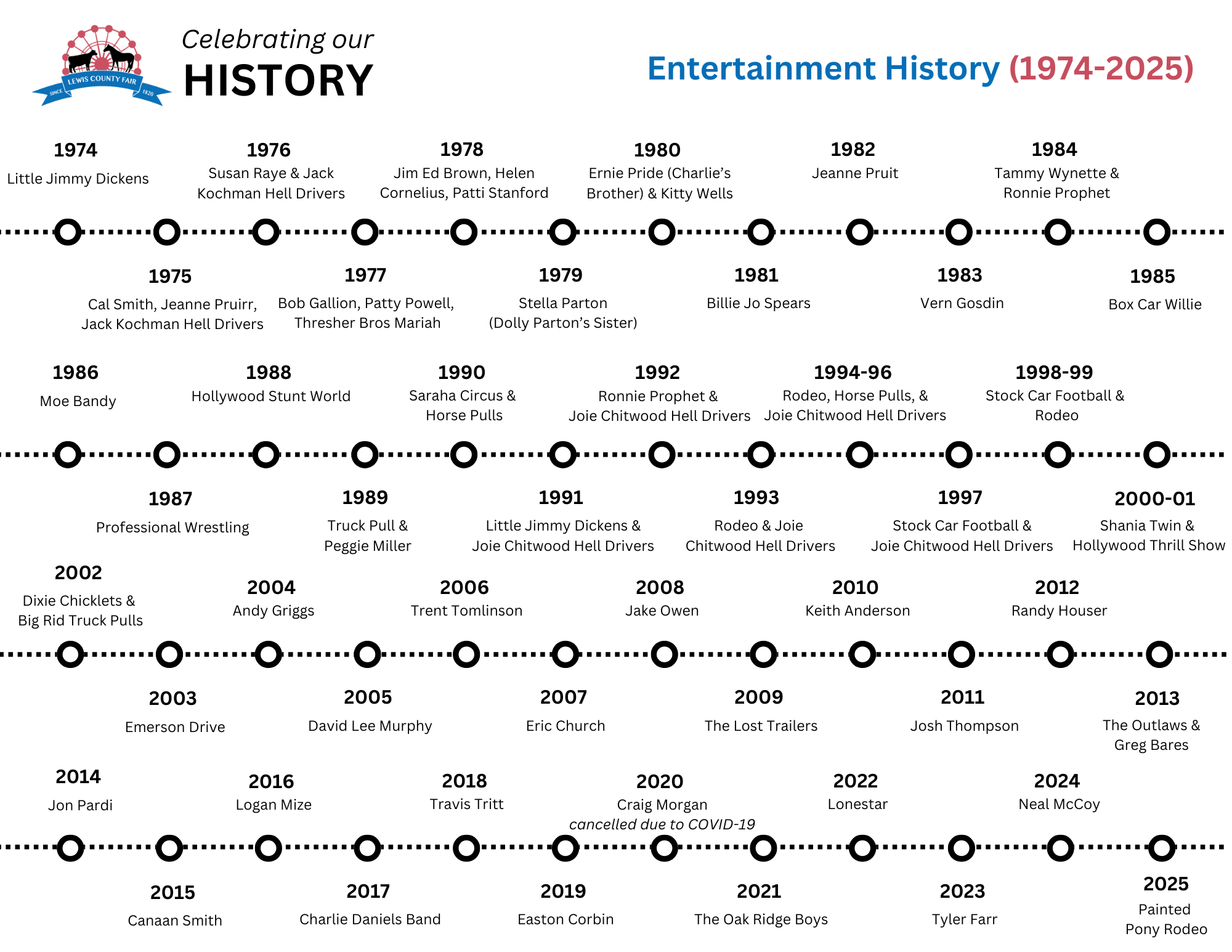 Country music concerts have long been a tradition the Lewis County Fair has been able to provide to the fairgoers. From many notable names like Little Jimmy Dickens, Stella Parton, Kitty Wells, Tammy Wynette, Box Car Willie, Jim Ed Brown, and local star Patti Stanford, to recent stars like David Lee Murphy, Eric Church, Randy Houser, Jon Pardi, and Travis Tritt. In the absence of a concert, or in some cases accompanying, other shows such as the Joie Chitwood Hell Drivers, Hollywood Thrill Show, rodeos, and circuses have won the memories of fairgoers. We hope that the tradition of memorable entertainment continues for many many years to come at the great Lewis County Fair!